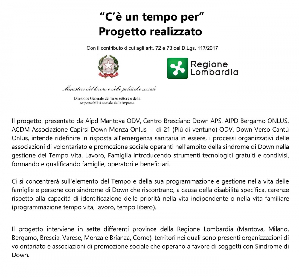 Il progetto, presentato da Aipd Mantova ODV, Centro Bresciano Down APS, AIPD Bergamo ONLUS, ACDM Associazione Capirsi Down Monza Onlus, + di 21 (Più di ventuno) ODV, Down Verso Cantù Onlus, intende ridefinire in risposta all’emergenza sanitaria in essere, i processi organizzativi delle associazioni di volontariato e promozione sociale operanti nell’ambito della sindrome di Down nella gestione del Tempo Vita, Lavoro, Famiglia introducendo strumenti tecnologici gratuiti e condivisi, formando e qualificando famiglie, operatori e beneficiari.