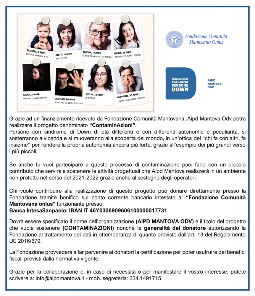 Se anche tu vuoi partecipare a questo processo di contaminazione puoi farlo con un piccolo contributo che servirà a sostenere le attività progettuali che Aipd Mantova realizzerà in un ambiente non protetto nel corso del 2021-2022 grazie anche al sostegno degli operatori.